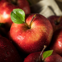 The picture shows a basket full of shiny, red apples with visible droplets of water on them. They are fresh and appear to be recently washed or have been in a moist environment.