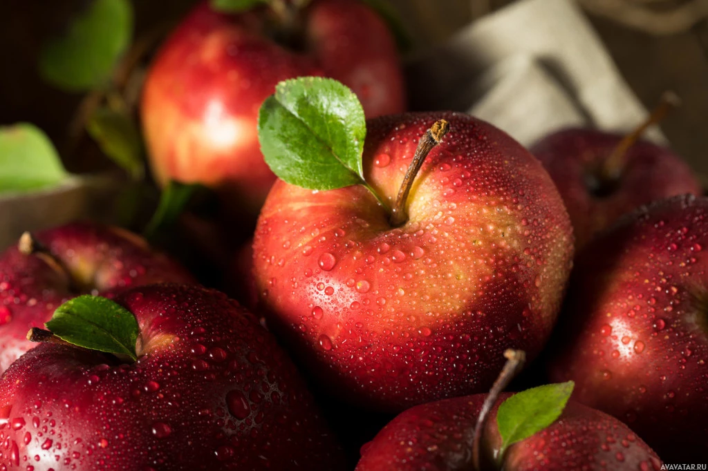 На картине изображена корзина, полная блестящих красных яблок с видимыми каплями воды на них. Они свежие и, по-видимому, недавно вымыты или находятся во влажной среде.