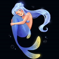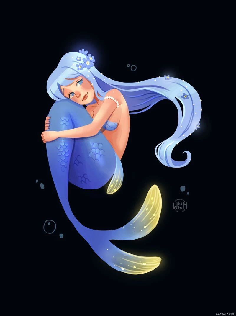 the ocean floor, surrounded by bubbles, which adds a whimsical touch to the illustration. The background is dark, possibly representing water, providing a contrast that highlights the mermaid's presence. The overall mood of the image is serene and dreamy, capturing the essence of a fairytale or fantasy character in
