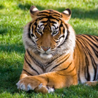 The image shows a tiger resting on the grass. It appears to be in a calm and relaxed state, with its eyes closed as if it's sleepy or simply taking a moment of leisure.