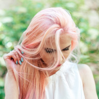 pink hair looking down. She appears to be in a park or