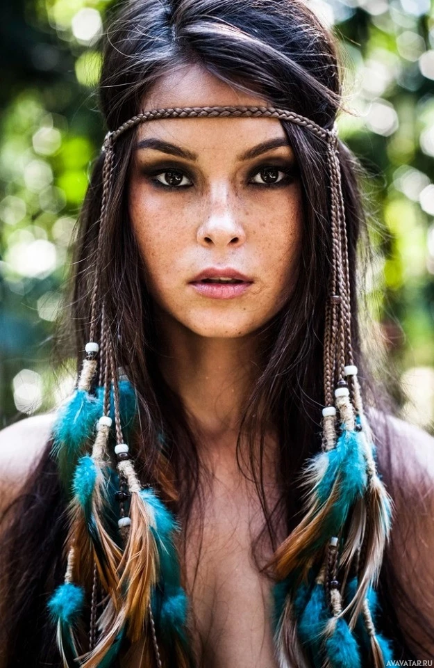 straight hair and is wearing an adorned headband that appears to be decorated with feathers or some other form of embellishment. Her