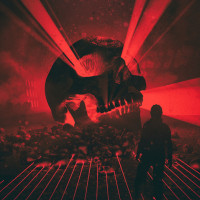 protective gear or suit. They are standing in front of an ominous red and black background that includes a large,