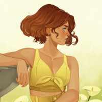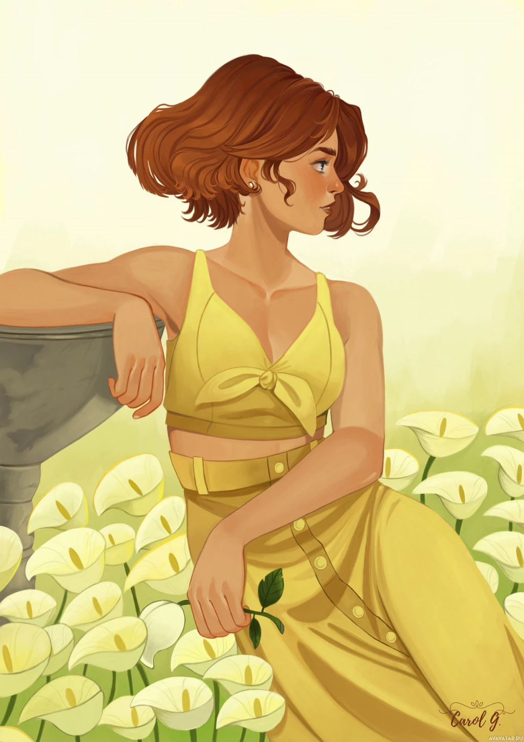 a stone wall or garden feature. She is dressed in a yellow sleeveless dress and holds