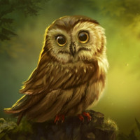 green lighting. The owl is depicted in a realistic and detailed manner, with its distinctive brown plumage,