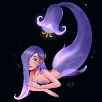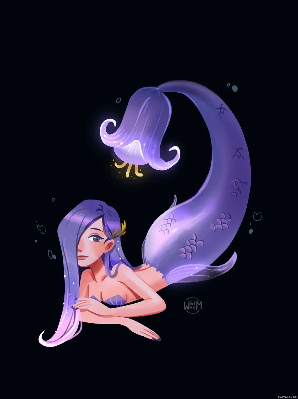 purple hair and a tail. She is lying down in what appears to be underwater, surrounded by bubbles that suggest movement or breathing, which adds to the fantasy element of the artwork. Her expression is serene and she has