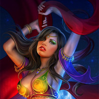 dark hair and is adorned in elaborate costume elements that include red and green jewels, suggesting a mystical or otherworldly theme. The character is reaching upwards towards the celestial bodies, which may imply a connection to the stars or