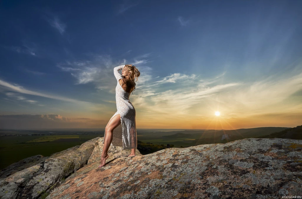 The picture shows a woman, who appears to be blonde and wearing a dress. She is standing on what looks like an elevated rocky surface at either sunrise or sunset, given