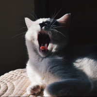 The image shows a cat with its mouth open, appearing to be yawning or making some vocalization. The cat has a white and gray coat, and it's sitting in what looks like a sunlit area, possibly inside