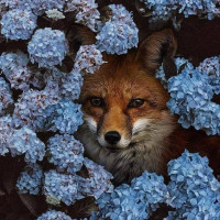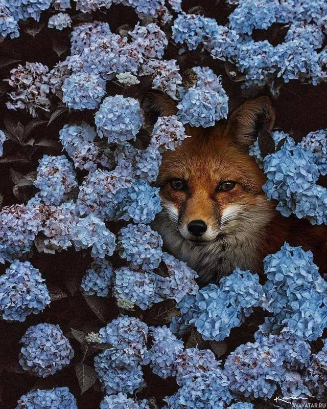На снимке изображена лиса, выглядывающая из-за цветов. Кажется, что лиса внимательно смотрит прямо в камеру, в то время как цветы создают красочный фон, контрастирующий с коричневой шерстью животного.