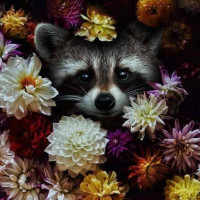 Картинка показывает енота, заглядывающего сквозь массив красочных цветов. Похоже, что енот смотрит прямо в камеру с выражением, которое можно интерпретировать как любопытное или осторожное. Фон наполнен яркими и разнообразными цветами, создавая яркую и оживленную сцену вокруг енота.