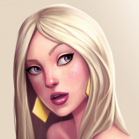 blonde hair, large expressive eyes with eyeliner and mascara, and is wearing earrings that resemble yellow bananas. The art style appears to be inspired by modern comic book illustrations, featuring exaggerated features such as