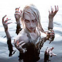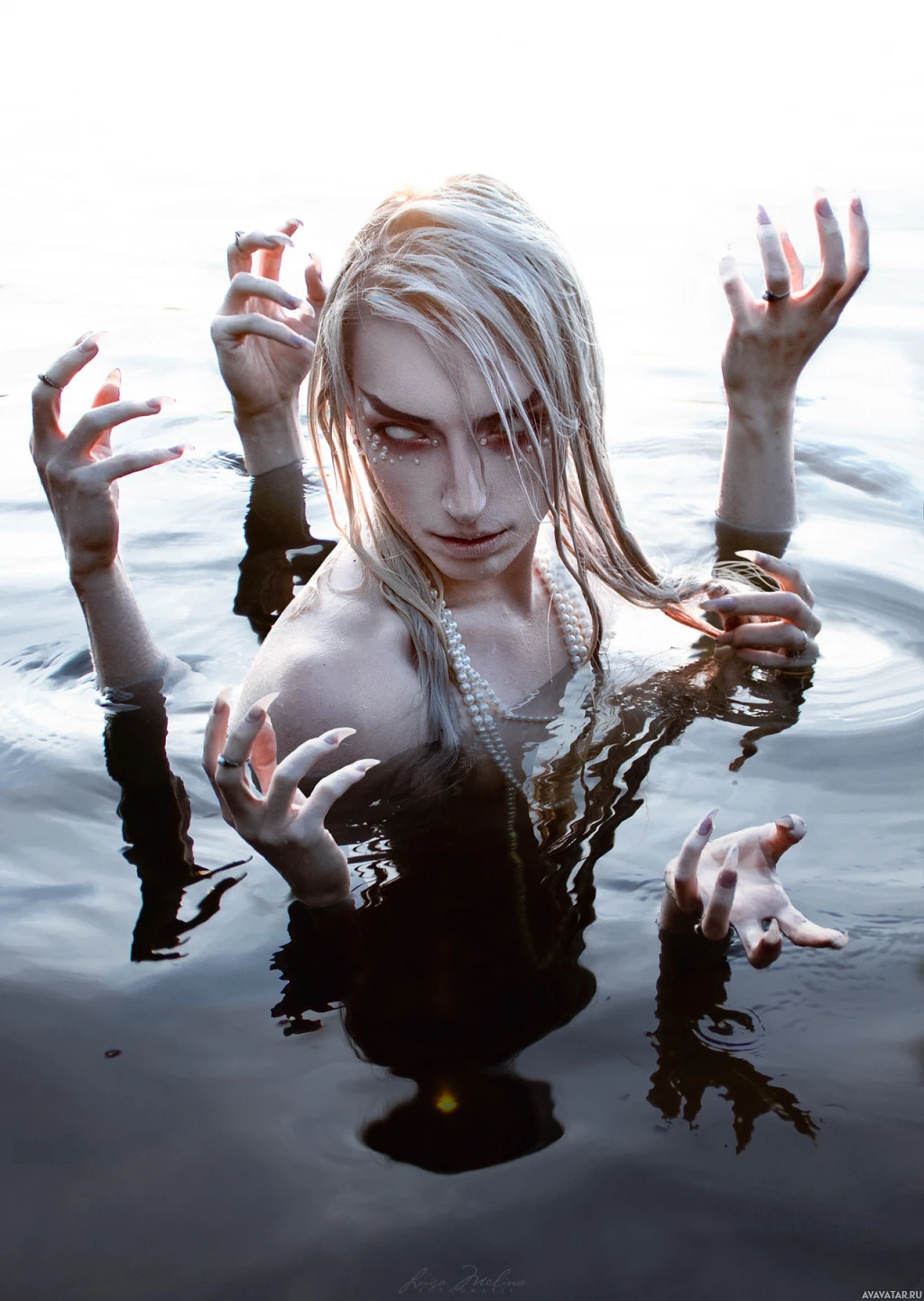 wet hair and pale skin. They appear to be in water up to their chest. The person's hands are raised above them, as if they are reaching out or gesturing in