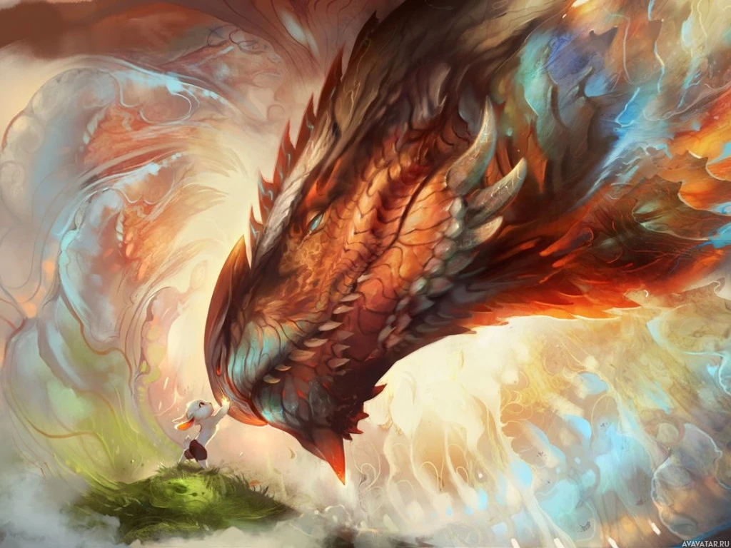 the magical atmosphere of the image. The rabbit is positioned in front of the dragon, seemingly unbothered by its size. Both creatures are drawn with a high