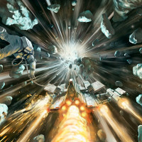 an astronaut in space, seemingly dislodged from a capsule and floating amidst debris. There are meteors or asteroids surrounding the character, with some coming very close. It looks like a scene of intense space activity, possibly suggesting