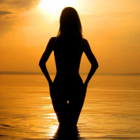 На картинке изображена силуэт девушки, стоящей на мелководье на закате. Солнце находится низко на горизонте, отбрасывая теплое свечение и создавая безмятежную атмосферу. Фигура девушки выделяется на фоне воды и неба.