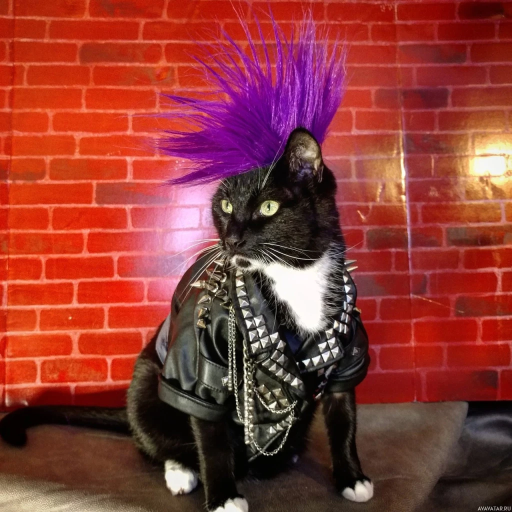 purple hair that appears to be styled in spikes. The cat is wearing a black