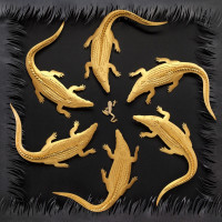 The image depicts a circular arrangement of golden alligators or crocodiles, with the central figure being different. This central character is not an alligator or crocodile but rather a small human-like figure in the center, surrounded by the larger reptilian figures. There is no frog depicted in this image; it features crocodiles and a person-like figure.