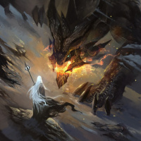 a fantasy scene featuring two dragons. One of the dragons appears to be in a more aggressive stance with its wings spread, while the other is sitting or lying down on what looks like