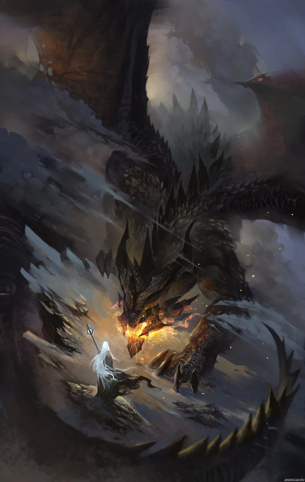 a dramatic sky with clouds that give off an ominous feeling. There are also small figures that appear to be humans in the foreground, possibly indicating that these dragons are part of a larger story or narrative involving