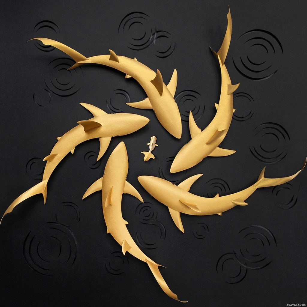 small model that resembles a fish within the circle created by the larger models. The arrangement gives the impression of sharks swimming together, possibly for an educational or decorative purpose.