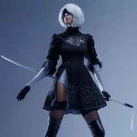 This image features a character that appears to be inspired by the game "Nier: Automata." The character is depicted in a pose that suggests readiness for combat, holding a sword and wearing armor with