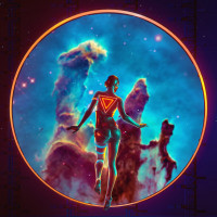 The image depicts a futuristic or sci-fi setting. There is a central figure who appears to be an astronaut standing inside