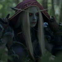The image shows a character from the video game "World of Warcraft" known as Sylvanas Windrunner. She is depicted in a forest setting with a hood up, which adds to her mysterious and powerful presence within the context of the game's lore.