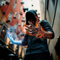 a hooded outfit and have flames coming from their hands, which gives the impression of being on fire. Ice is also visible around them, possibly indicating that they are in