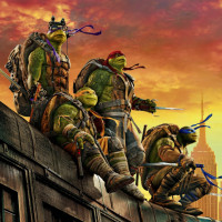 Mutant Ninja Turtles franchise. They are perched on a ledge or wall that overlooks a cityscape with a prominent skyline that could resemble