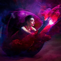 brown hair sitting on the ground, surrounded by a vibrant burst of colors that resemble a magical explosion or energy. She appears to be in a state of