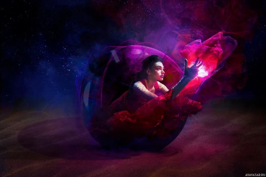 a nighttime setting. The overall tone of the image is fantastical and surreal, with a focus on the woman's connection to