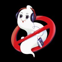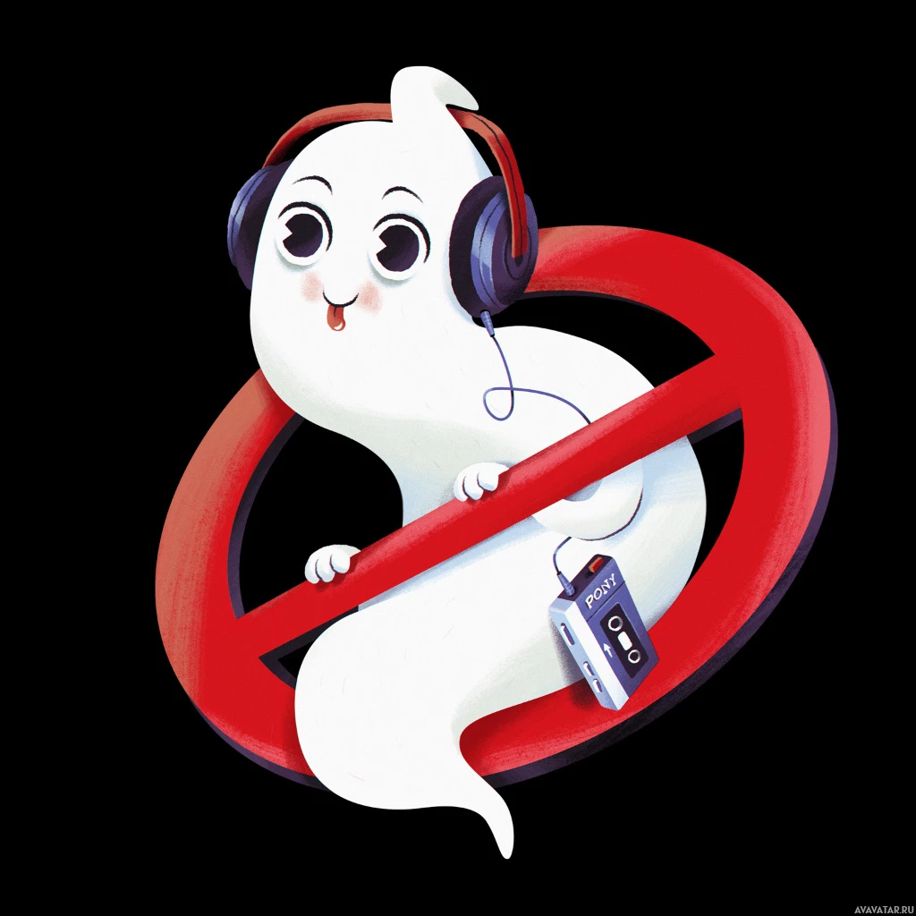 a cartoon character resembling the Ghostbusters logo. This character is a friendly-looking ghost with a white body and large