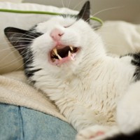 The image shows a cat lying on its back with its mouth open and tongue out, appearing to be making