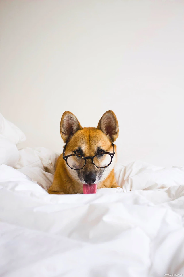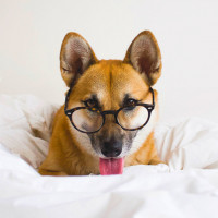 an impression of relaxation. There are glasses placed over the dog's eyes, creating a humorous and adorable effect as if the dog were wearing them. The background is neutral-toned, focusing attention on the dog itself.