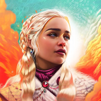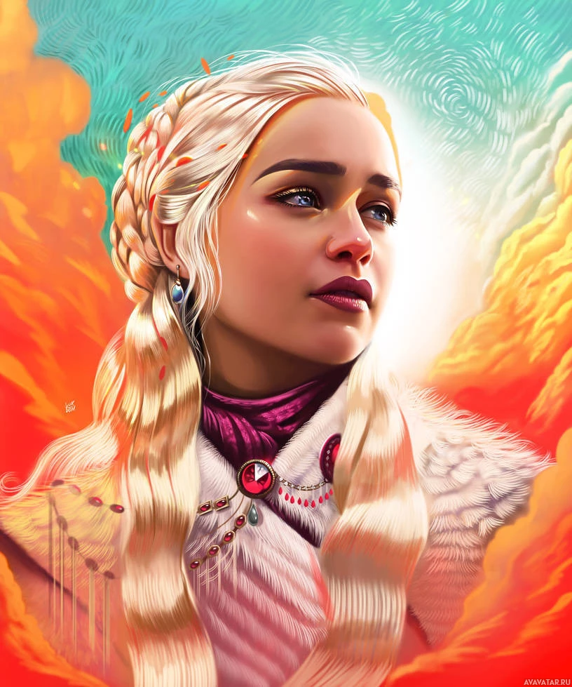 Daenerys Targaryen, portrayed by actress Emilia Clarke. She is depicted with her hair styled in loose braids and wearing