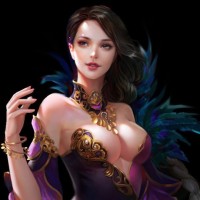 dark hair and is wearing makeup with a neutral expression on her face. Her attire includes intricate details like feathers and what seems to be gold or silver embellishments, suggesting she might be playing the role of a deity, witch, or other