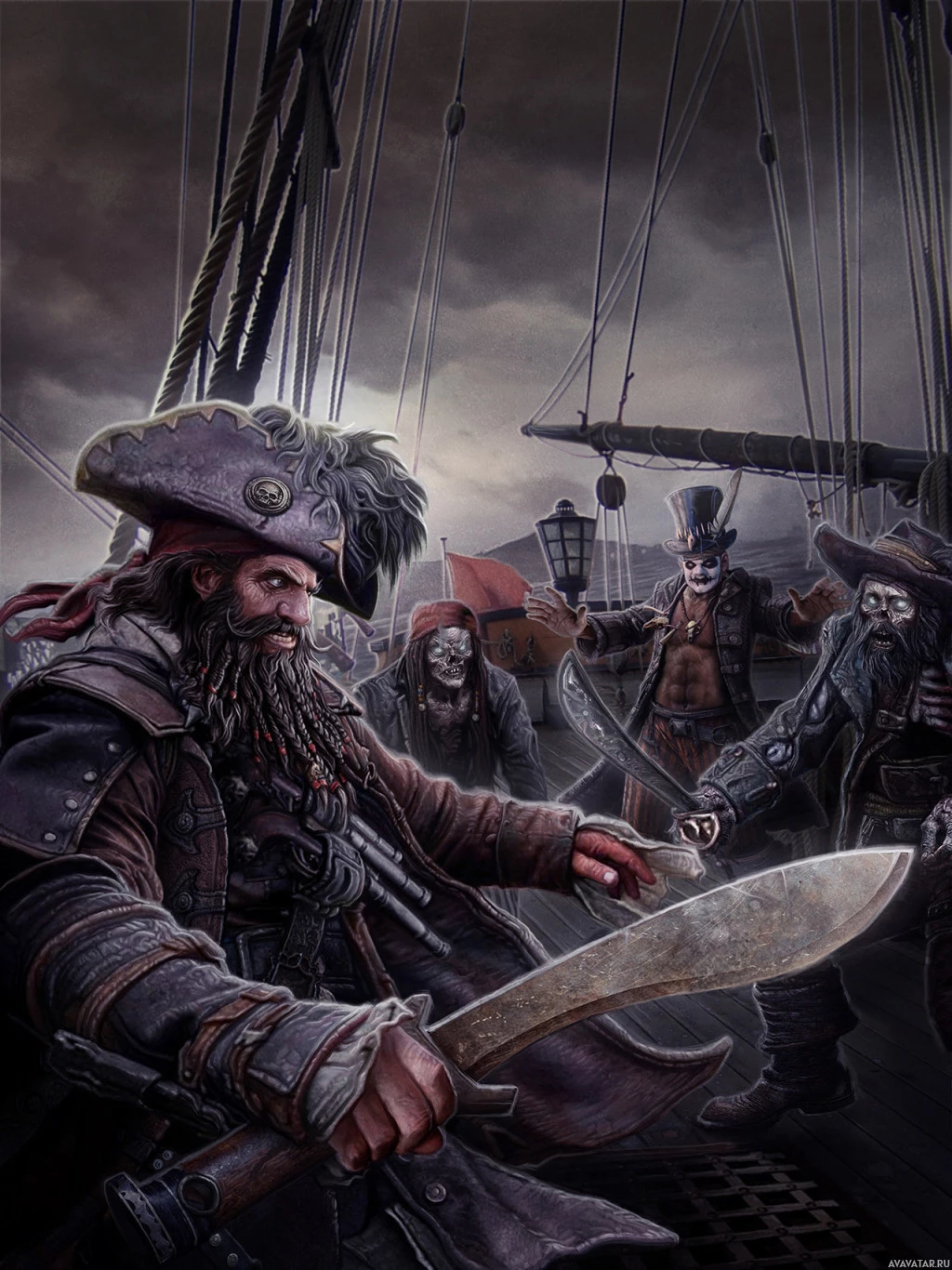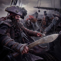 a dramatic scene of pirate characters, each with distinctive outfits and props that are characteristic of the historical "Golden Age of Piracy." In the foreground, there is a man wielding two swords crossed in front of him. He has a beard and