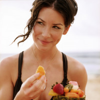 На снимке изображена женщина со светлой кожей, которая кажется брюнеткой. Она позирует и улыбается в камеру, поедая кусочек ананаса из свежесрезанного ананаса. За ней пляжная сцена с океанскими волнами, видимыми на заднем плане.
