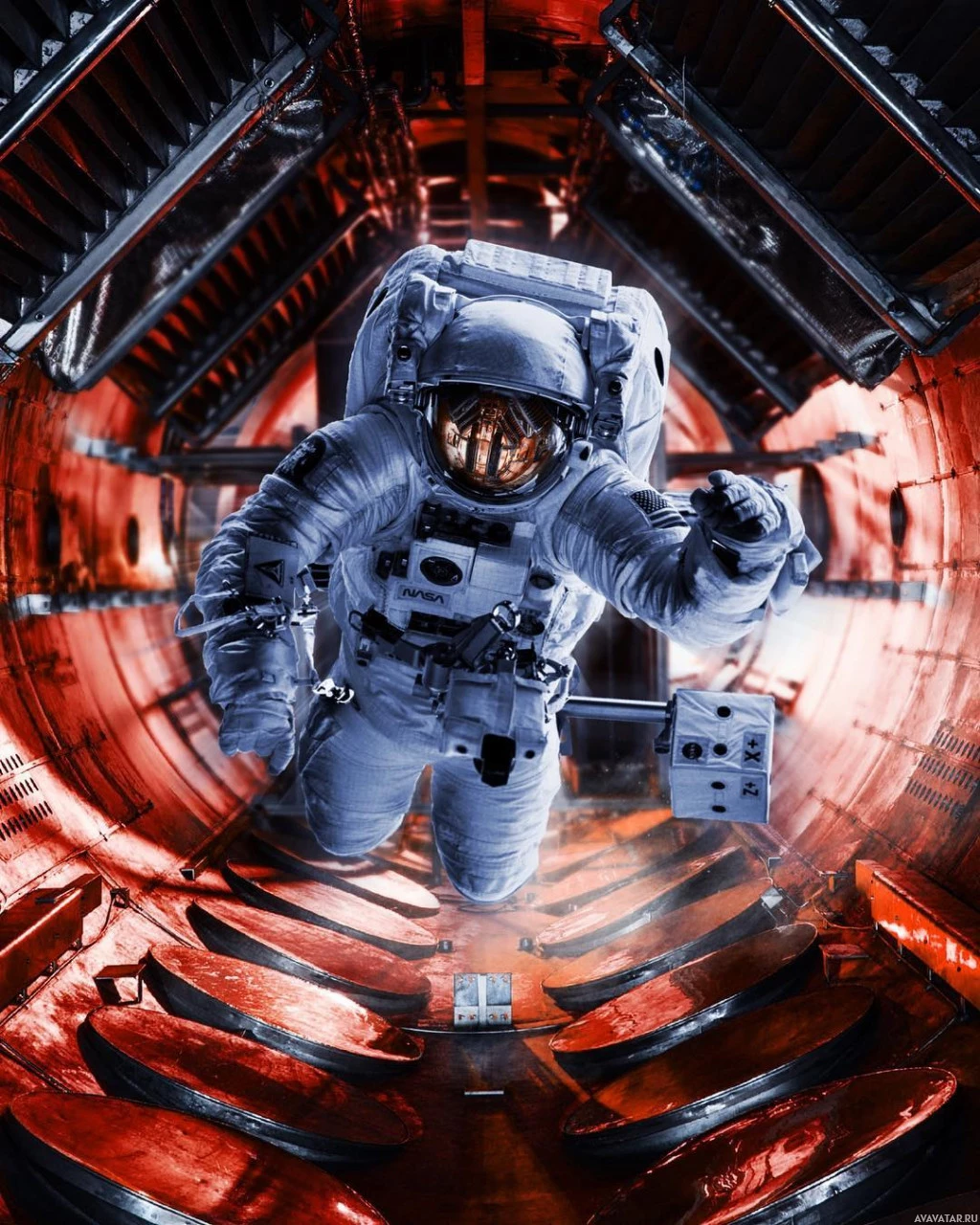This image features an astronaut inside a spacecraft, specifically within the launch vehicle's crew module or