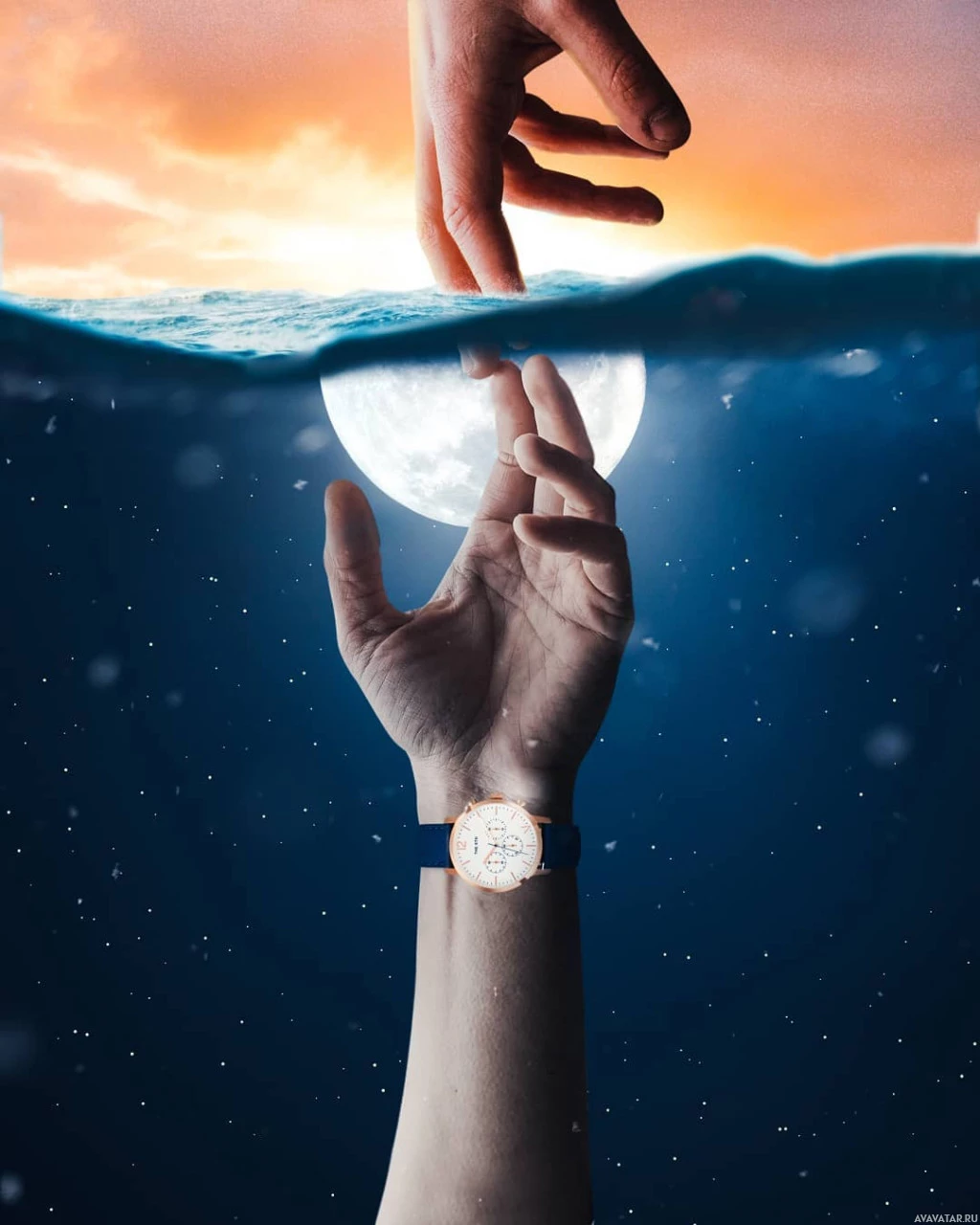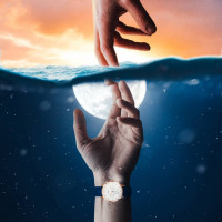 The image depicts a surreal and artistic scene where a person's hand is emerging from the water, reaching out towards another hand that seems to be above