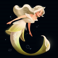 blonde hair and is wearing what appears to be a sea shell top and skirt that matches the colors of a seashell, with yellow and green hues. The mermaid is depicted with