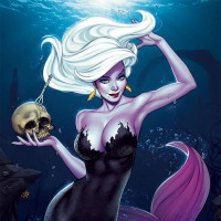 a black dress and has a skull in her hand, which she appears to be holding over her shoulder. The setting is underwater, surrounded by various