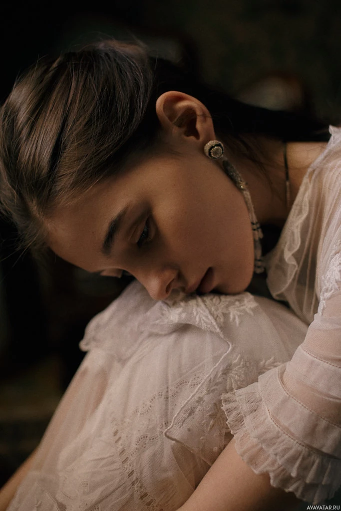 a young woman with long brown hair. She appears to be in a contemplative or sad mood, as she is looking down and resting her chin on her hand. Her attire consists of a light-colored, possibly off-white or cream-colored, dress with lace detailing at the neckline, which could suggest