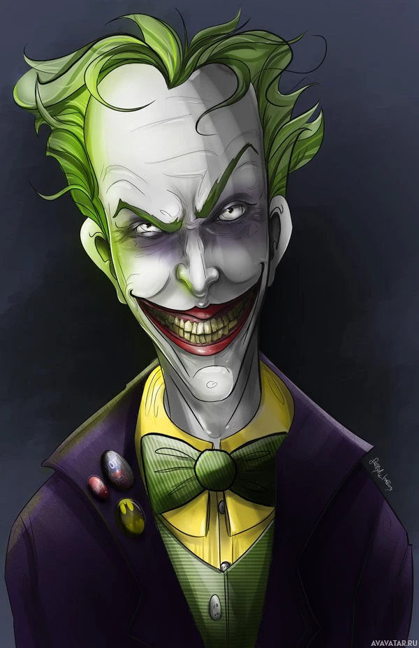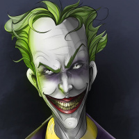 the Batman universe. The Joker is depicted with his iconic white skin, green hair, and distinctive makeup that includes painted tears on either side of his face, red paint around the mouth area, and a wide grin that exposes
