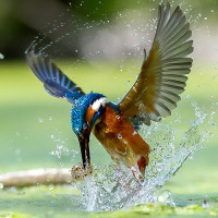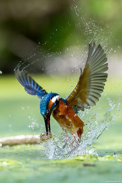 На картине изображена птица, в частности, синяя и оранжевая птица, которая широко известна как Евразийский Крысолов. Он находится в середине полета с широко расставленными крыльями, и, похоже, он взлетает или приземляется на водоем. Окружающая область предполагает, что это может быть водно-болотное угодье или место обитания пруда.