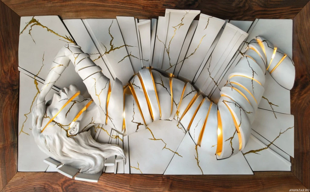 The image shows a decorative wall panel with a design that resembles a horse lying down. The artwork incorporates the use of