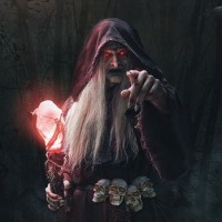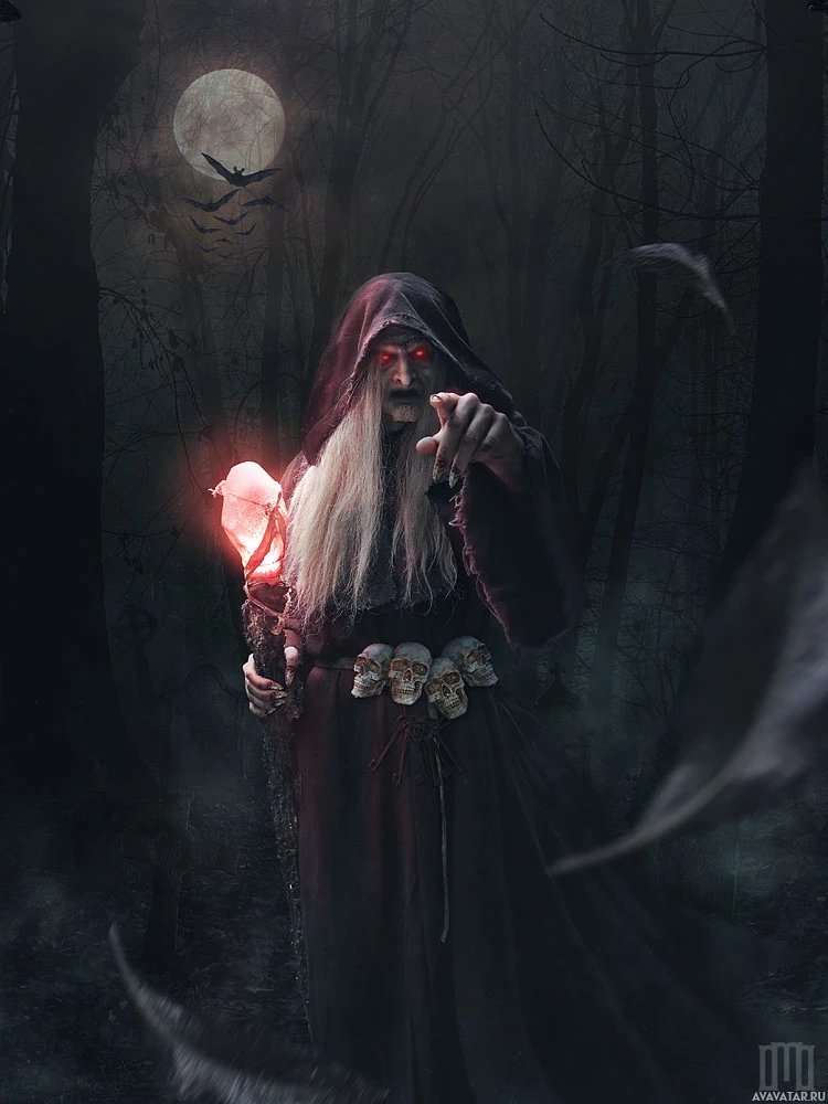 a fantasy character who appears to be a wizard or sorcerer in a dark, foreboding setting that could be associated with horror. The character is dressed in