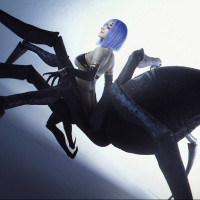segmented legs and a body that looks like the abdomen of a spider. The person also has hair styled to resemble tentacles or antennae, which adds to