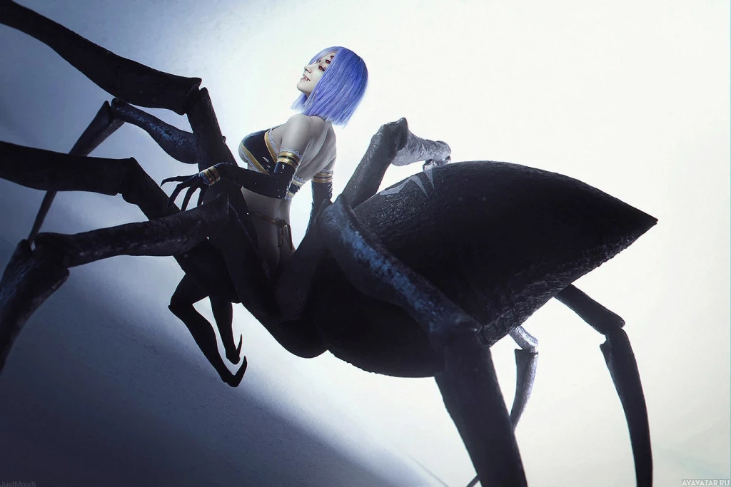 a cosplay costume that resembles a spider. This cosplay is particularly detailed, with the individual dressed in blue and black attire that mimics a spider's exoskeleton, complete with
